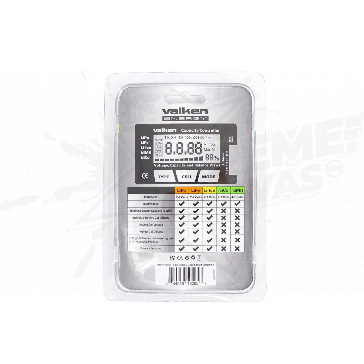 The Valken Battery Tester is a great personal item to have to ensure your battery pack is still game-ready after countless uses! The airsoft battery tester can quickly check the remaining charge of various NiCd, NiMh, LiFe, LiPo, and Li-Ion airsoft battery packs. Its easy-to-read digital display lets you know at a glance if your airsoft battery pack needs recharging. The battery tester also displays the voltage of each cell, so you know when your battery needs balancing. It can also display the internal resistance of each individual cell, so you can assess the health of your battery pack and decide when to discard or replace it. We recommend using any of our Valken airsoft battery packs with this battery tester.