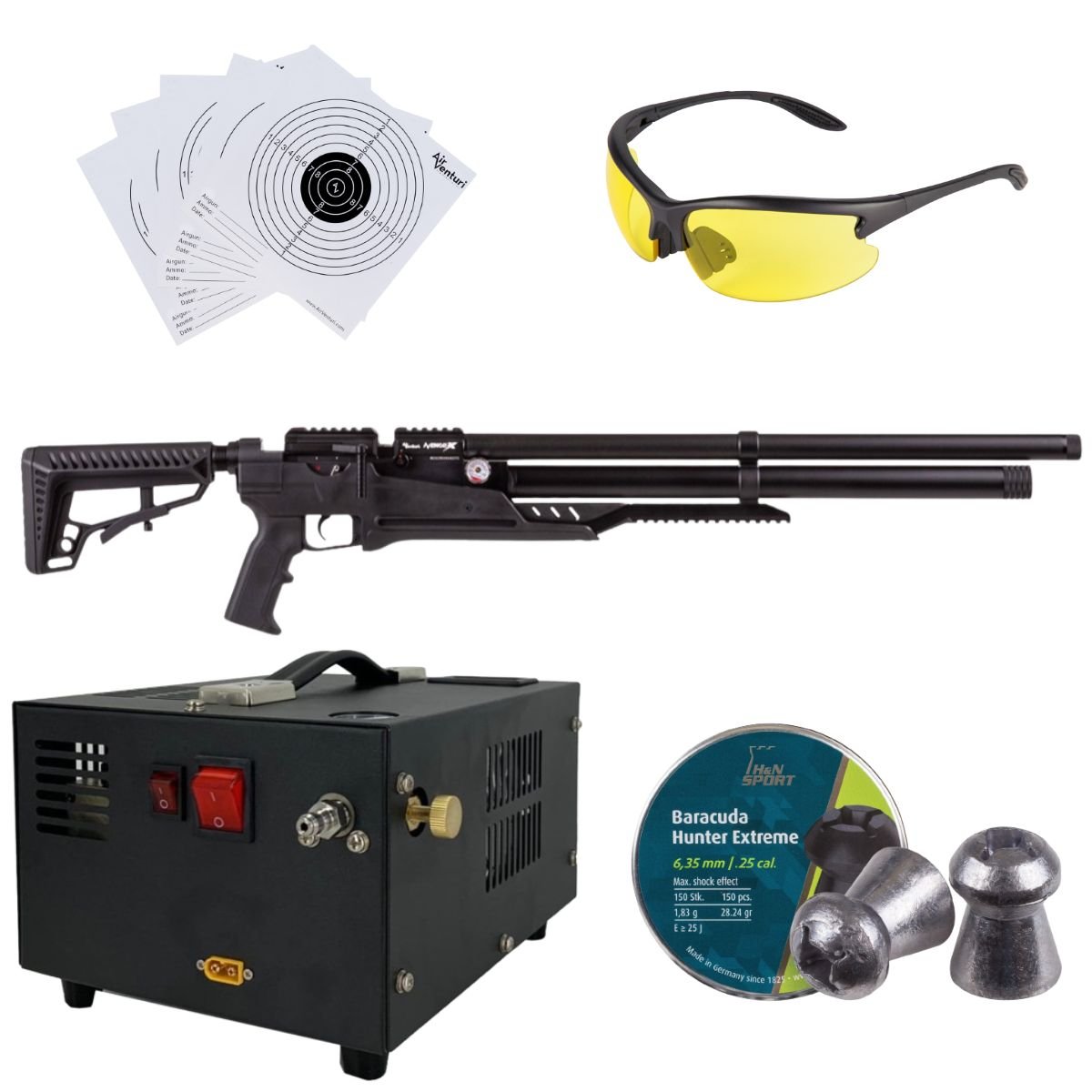 Rifle Air Venturi Avenge-x Tactical PCP .25 (6.35mm) TUBE 210cc Kit w/compressor, pellets, lenses, targets.