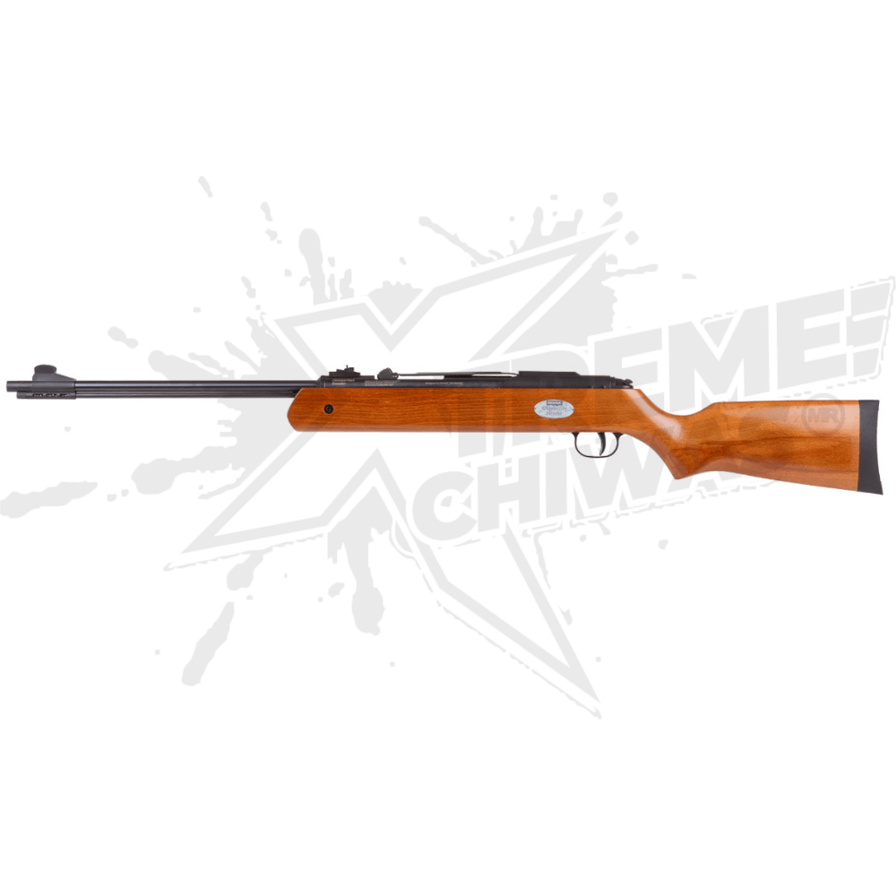 This air rifle, also known as the Diana Oktoberfestgewehr, features a distinctive top cocking lever that starts on the side, rotates to the top, then is pressed back to cock, and finally pushed back to the original position before firing. Another unique feature is the under-barrel magazine tube, which holds up to 100 rounds and has three slots near the front to allow the shooter to see the ammunition and know when the need to reload is approaching.