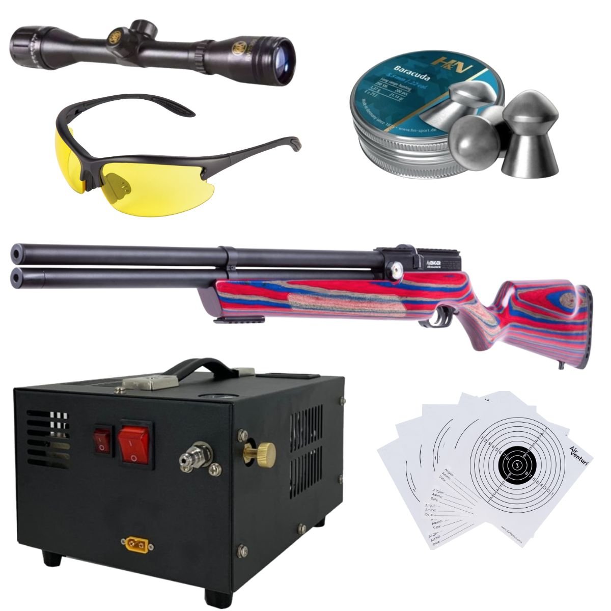 PCP AIR RIFLE VENTURI AVENGER RED/BLUE .22 w/compressor, pellets, scope, lenses, targets.