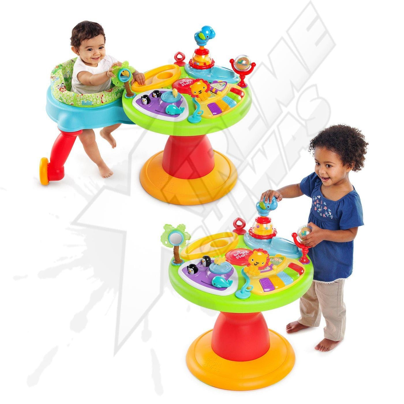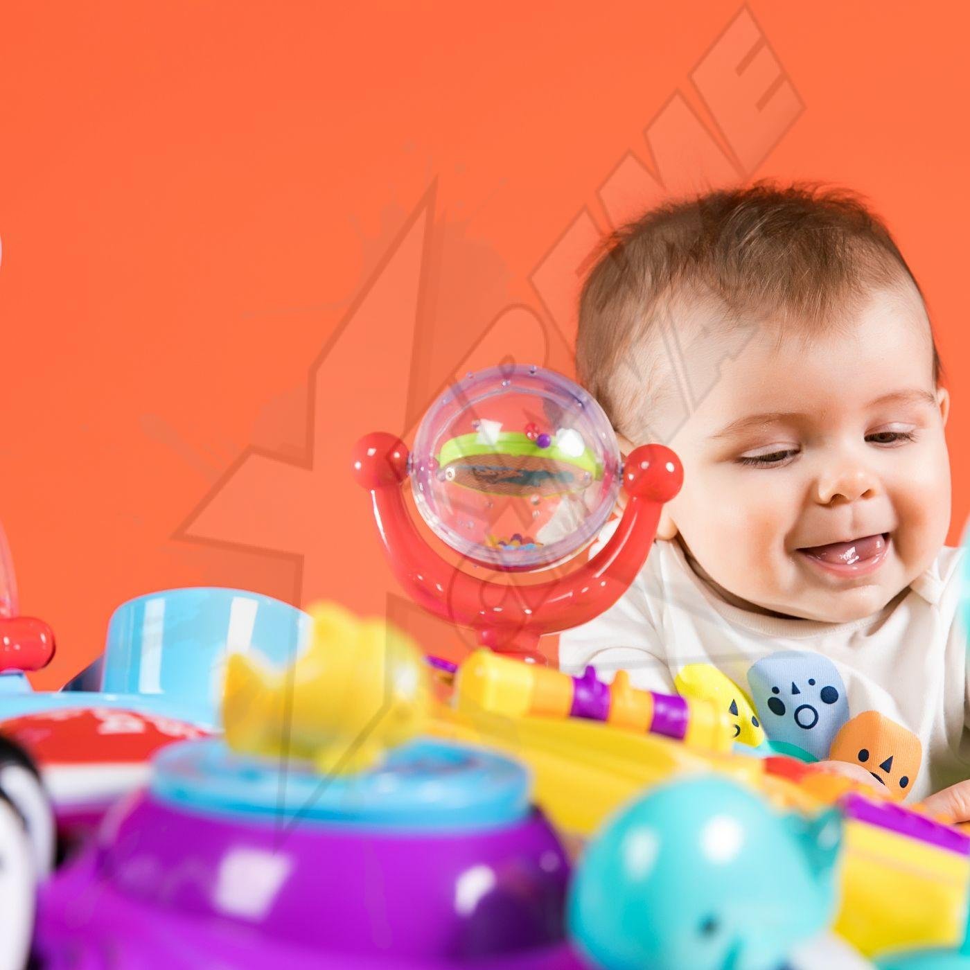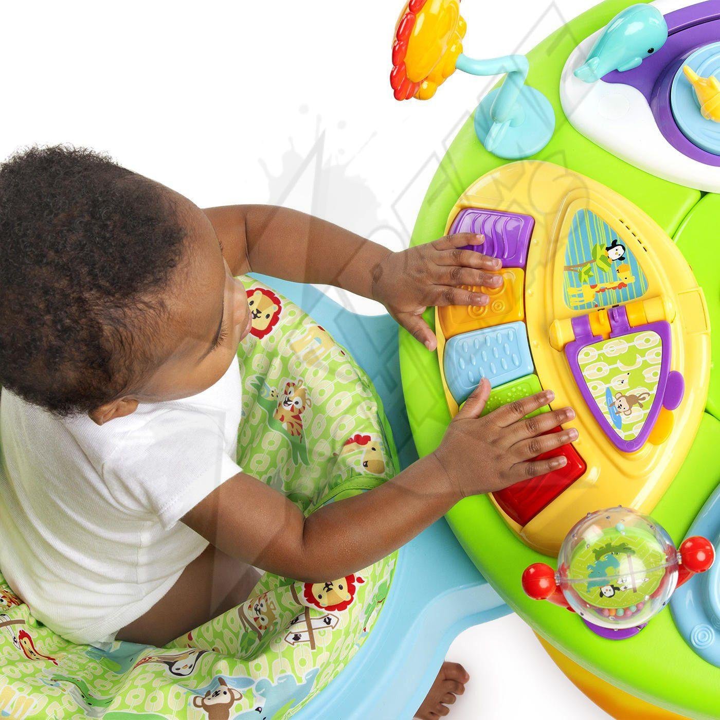 Running in circles can be a good thing! Meet the most active activity center for your baby. The seat rotates all the way around the baby’s activity saucer. Your daring baby can run and play in one place! Let your little one move from one toy to another and back again (while staying in your line of sight). This baby standing table includes 15 activities: No boredom here.