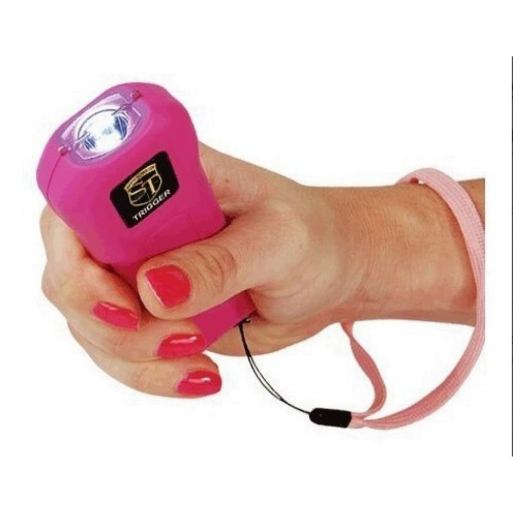 The Safety Technology Trigger 80,000,000 Volt Stun Gun Flashlight with Wrist Strap Disabling Pin features a unique trigger design for easy operation and a lifetime warranty. With one quick pull of the trigger, you can have an attacker begging for mercy. It has a rubber coating to ensure a nice, tight grip. The super-bright 100-lumen flashlight will blind any attacker or can be used as an everyday flashlight. The Safety Technology TRIGGER Stun Gun’s stopping power is excellent, with 4.8 milliamps of electrical current to take down an enemy. There’s no need to keep track of another charger, as the charger prongs are built into each unit. The nickel-cadmium battery charge can last up to 3 months, depending on usage. The Trigger stun gun comes with a disabling wrist strap, which is an added safety feature. With the strap around your wrist, if the stun gun were to be pulled out of your hand or taken by a thug, it would be rendered useless. Measures 4 5/8″ x 1 3/4″ x 7/8″