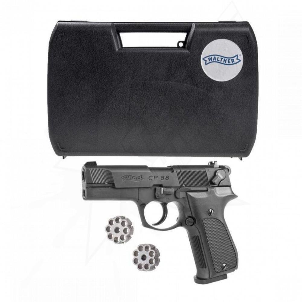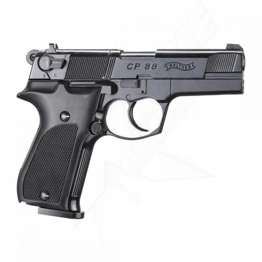 The Walther CP88 Airguns are firearm replicas, have a smooth trigger, are made in Germany, have a manual safety, adjustable rear sight, double 8-shot rotating magazine and replaceable front sight. With its full metal body and its ability to fire pellets at a speed of 400 fps, this replica is one of the most purchased in the world of air guns.
