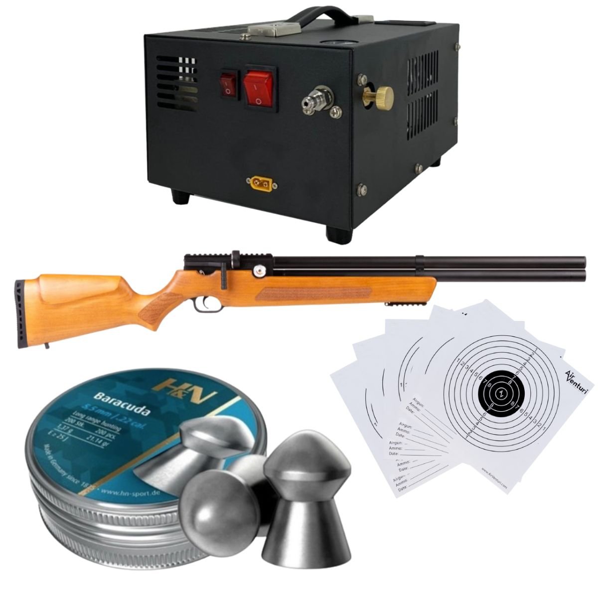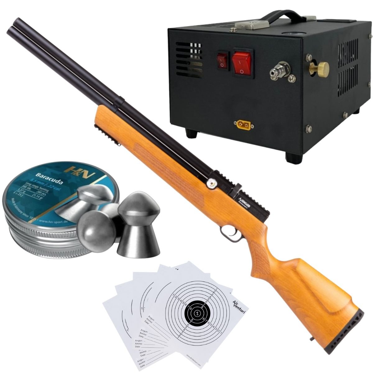 Venturi Avenger Wood Air Rifle Regulated PCP .22 Kit W/Compressor, Pellets, Targets.